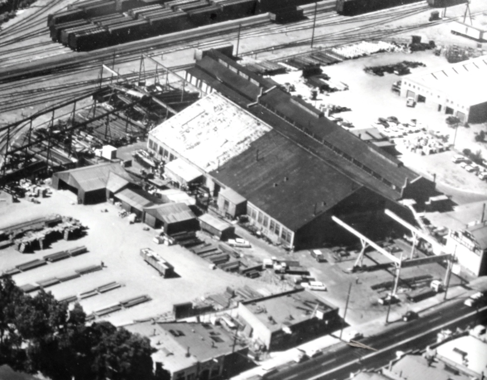 Aerial view, early 1960s With 4th Street at the bottom of the photo, an aerial view of the Martin Iron Works site shows the original A-frame construction of the main shop building before a fire in 1962 that required the entire section to be rebuilt. Source: Piero Bullentini Date: Early 1960s